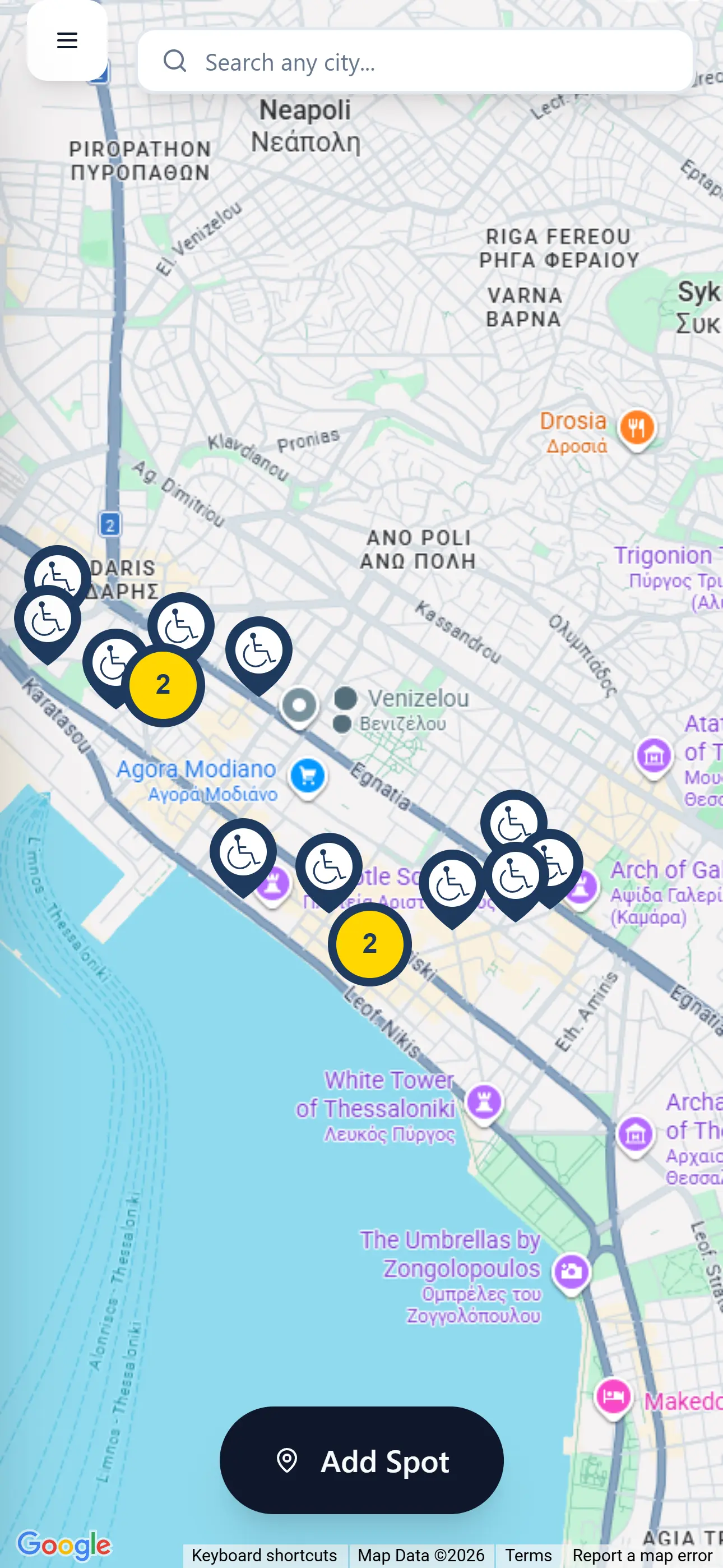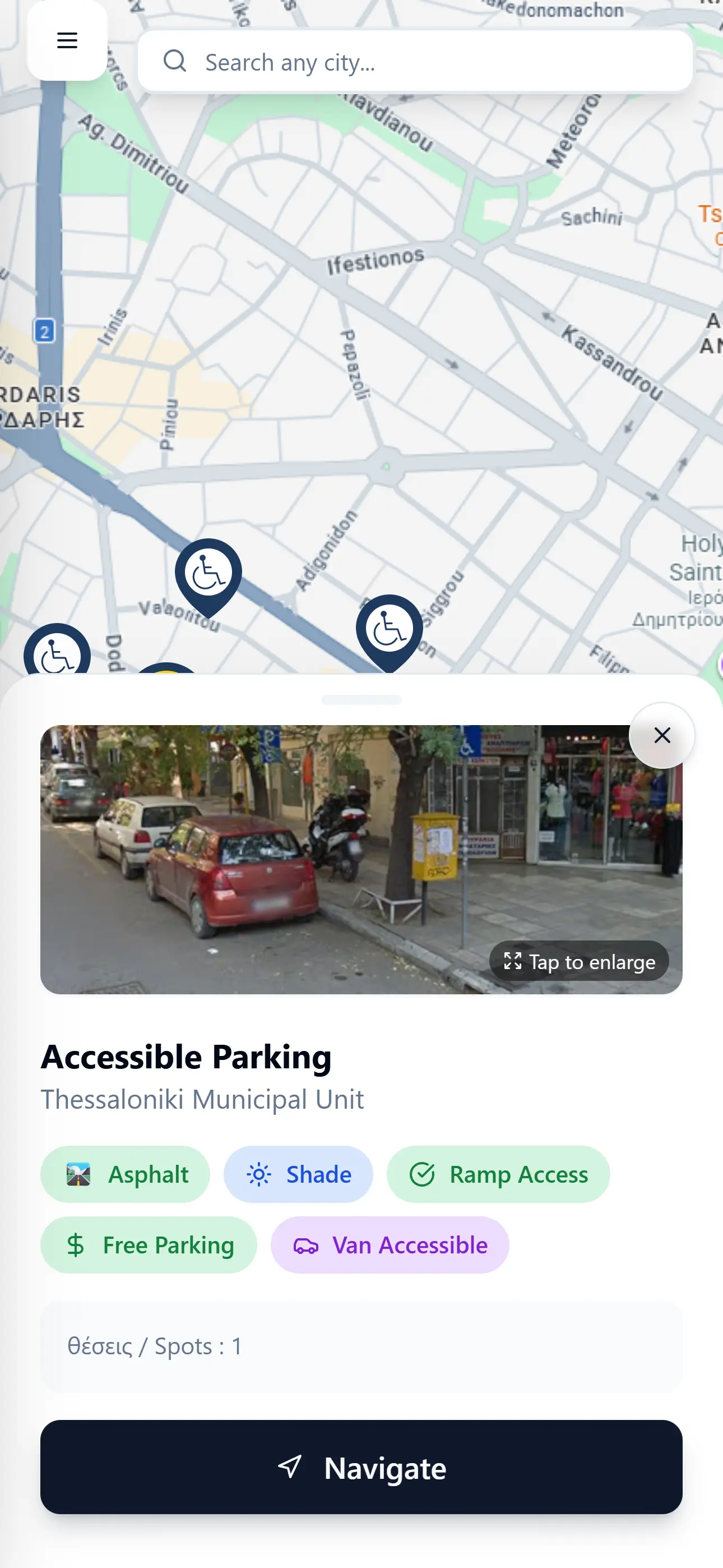 Σχεδιάσαμε και αναπτύξαμε μια Web και Mobile εφαρμογή που εμφανίζει σε διαδραστικό χάρτη όλες τις θέσεις στάθμευσης για ΑμεΑ σε όλη την Ελλάδα. Ο χρήστης βλέπει άμεσα τις κοντινότερες διαθέσιμες θέσεις, με πληροφορίες για τον αριθμό τους και την ακριβή τους τοποθεσία.
